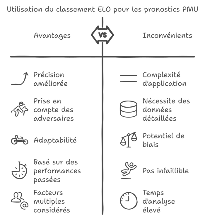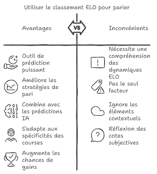 Le classement ELO est un outil d'analyse puissant qui peut vous aider à faire la différence en tant que parieur, même si vous êtes un débutant. En combinant ce classement avec les prédictions IA et en vous adaptant aux particularités de chaque type de course, vous pourrez progressivement affiner vos stratégies et améliorer votre taux de réussite. Rappelez-vous, la clé est de bien comprendre les dynamiques des scores ELO et de les appliquer intelligemment pour chaque course. N'hésitez pas à confronter vos observations avec les pronostics gratuits disponible sur les sites comme equidia, geny, pmu et ceux de la presse spécialisée.