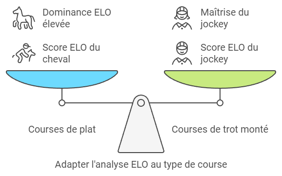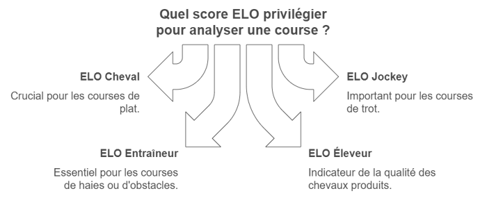 En fonction de chaque type de course, l'importance de ces scores peut varier. Par exemple, pour les courses de plat, le score ELO du cheval est prépondérant, tandis que pour le trot, le score du driver joue un rôle plus important. Pour les courses de haies ou d'obstacles, l'entraîneur et l'éleveur prennent souvent une importance décisive.