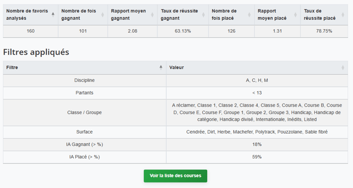 Exemple 2 – Si le cheval est favori, IA Gagnant > 20 % et ELO > 1500