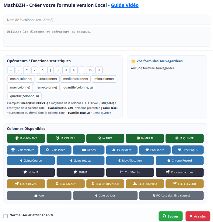 MathBZH est l'outil avancé de Turf.bzh permettant aux parieurs hippiques de créer facilement des formules de calcul personnalisées à partir d’indicateurs clés (IA, ELO, Turf Points, etc.) afin de perfectionner leurs pronostics.