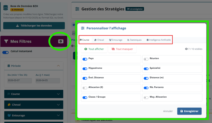 Si le nombre de filtres vous semble écrasant au départ, pour rappel, cliquez sur l'icône ⚙️ en haut du panneau "Mes Filtres". Un panneau de personnalisation s'ouvre : décochez les indicateurs que vous n'utilisez pas. Ils disparaissent de l'interface sans que vos données soient perdues. Vous pouvez les réactiver à tout moment. Le bouton "Sauf" disponible sur les filtres à choix multiples permet d'inverser une sélection : cocher "Vincennes" avec "Sauf" activé vous donne toutes les courses sauf celles de Vincennes.